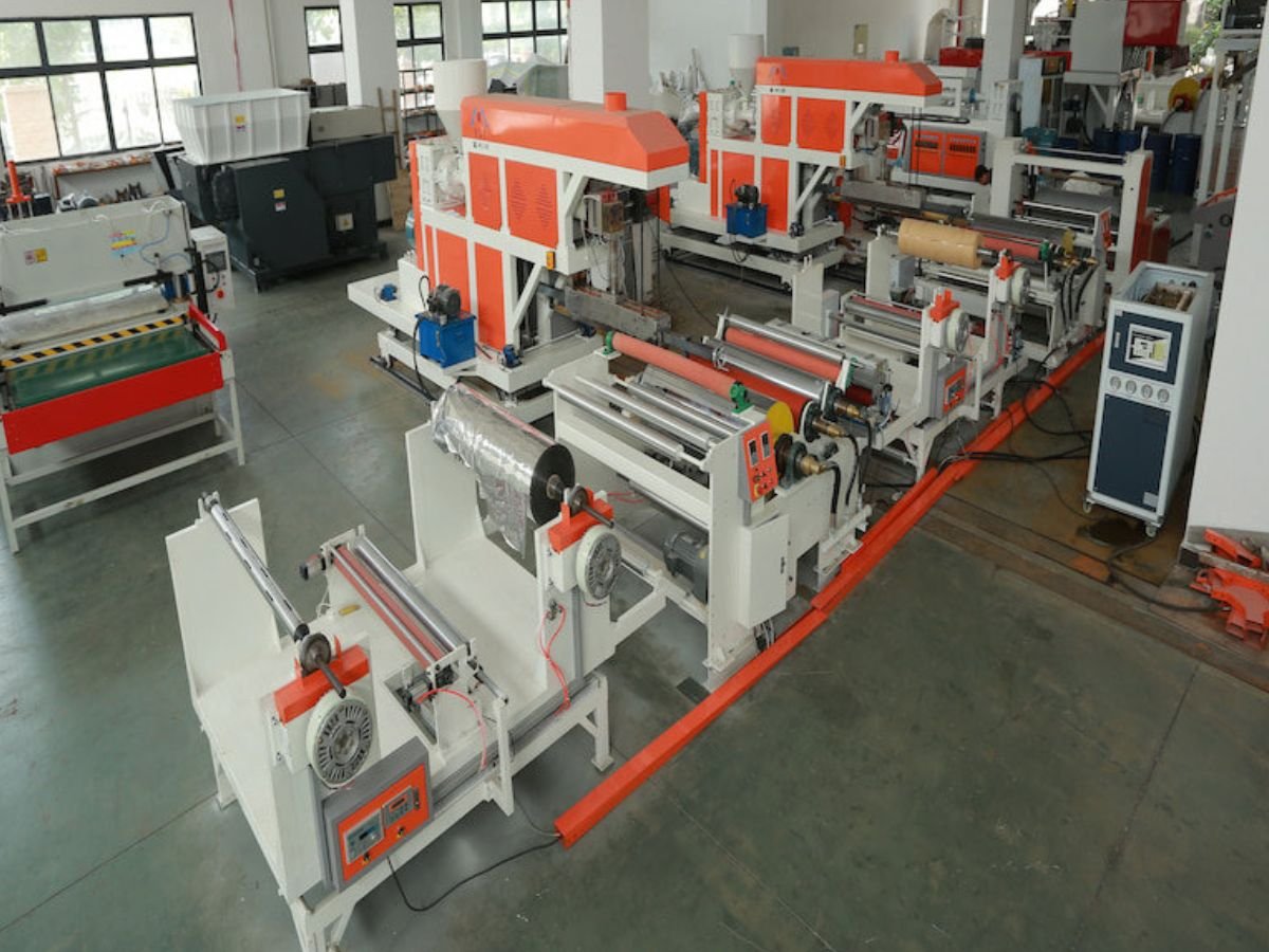 Экструзионный ламинатор для ламинирования листов из вспененного полиэтилена с полиэтиленовой пленкой, цветной пленкой, ПВХ, алюминиевой фольгой и другими материалами.